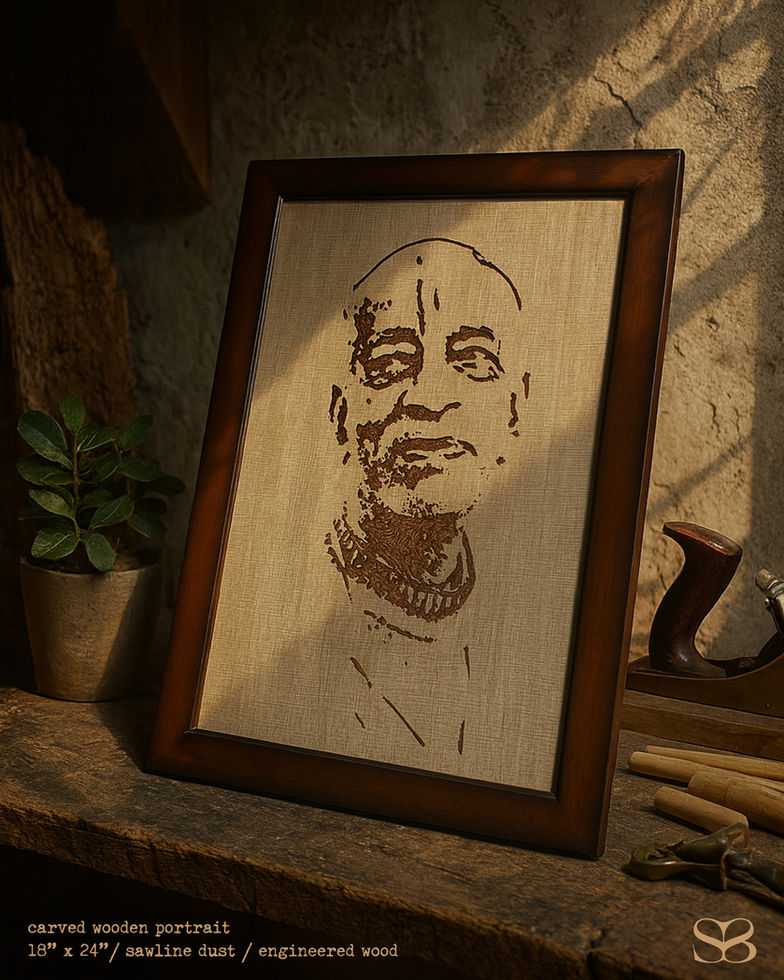 Essence: A bespoke, hand-carved portrait—your visage rendered in depth, lines, and shadow, housed within a 18″ × 24″ frame.